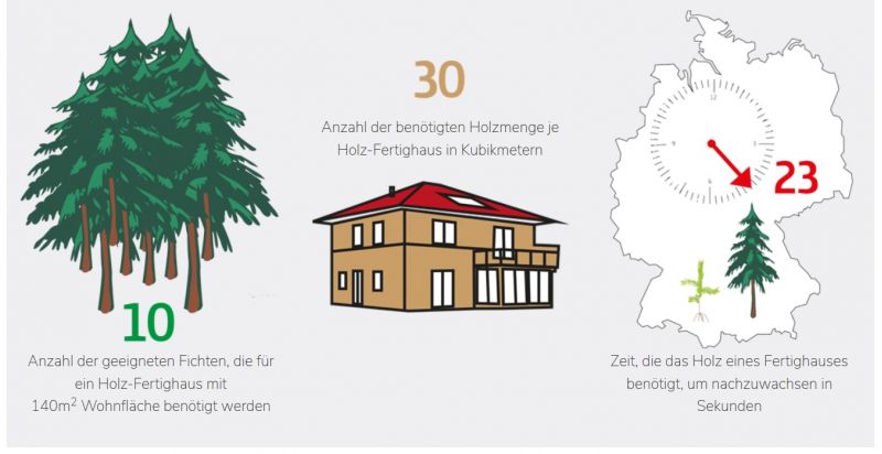 Der Großteil des Holzbedarfs eines modernen Fertighauses wird vom Hersteller mit einheimischem Fichtenholz abgedeckt. Rund 30 Kubikmeter davon benötigt er für ein durchschnittliches Fertighaus mit einer Wohnfläche von 140 Quadratmetern. Das entspricht dem verwendbaren Konstruktionsholz von zehn Fichten. Diese Menge an Konstruktionsholz wächst hierzulande statistisch gesehen in gerade einmal 23 Sekunden nach. Demzufolge bietet allein der Zuwachs von Fichtenholz in Deutschland genug Baumaterial für weit mehr als 150 Häuser pro Stunde.